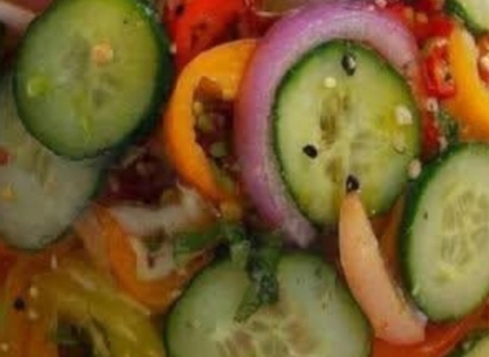 - Thinly slice cucumbers, onion, and bell peppers.