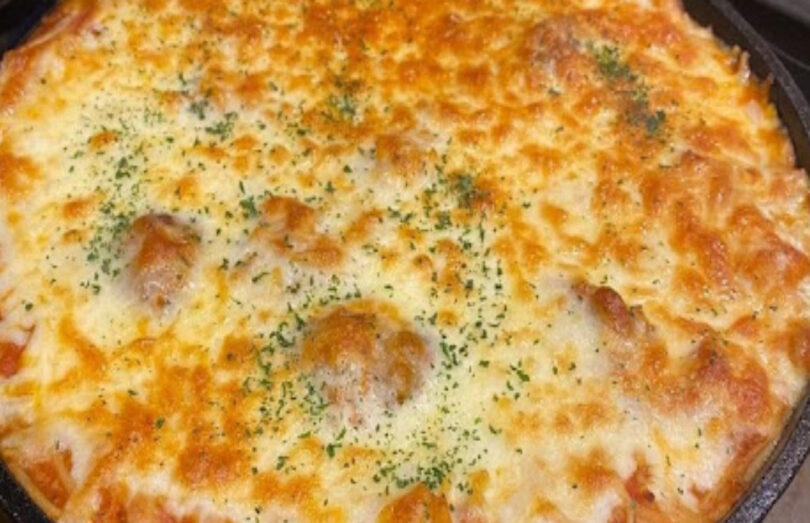In the meanwhile, bring a skillet to a medium-high temperature. For about 5–7 minutes, while stirring occasionally, brown the ground beef in the heated pan until it becomes crumbly. Remove excess fat and combine with spaghetti sauce.
