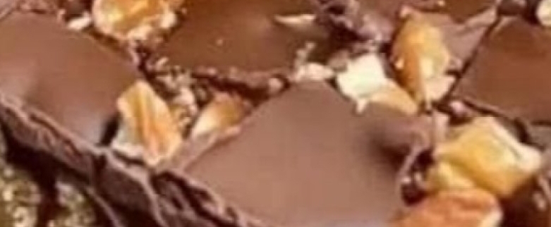 3. Top with chocolate: In a dish that can be microwaved, melt the semi-sweet chocolate chips by heating them for 30 seconds at a time while stirring until smooth. On top of the caramel layer, evenly distribute the melted chocolate. As a finishing touch, you may drizzle some white chocolate over the top.