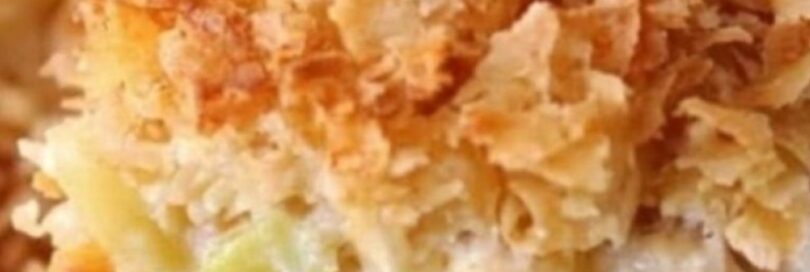 Preheat Your Oven:Preheat the oven to 375°F (190°C). Lightly grease a 9×13-inch baking dish.Prepare the Filling:In a large mixing bowl, combine the cooked chicken, cream of chicken soup, sour cream, shredded cheese, peas, carrots, garlic powder, onion powder, salt, and pepper. Mix until everything is well combined.Assemble the Casserole:Spread the chicken mixture evenly into the prepared baking dish.Make the Topping:In a small bowl, mix the crushed cornflakes with melted butter until evenly coated. Sprinkle the topping over the casserole.Bake:Place the casserole in the preheated oven and bake for 25–30 minutes, or until the top is golden brown and the filling is bubbling.Serve:Let the casserole cool for a few minutes before serving. Pair it with a fresh salad, steamed veggies, or dinner rolls for a complete meal.Tips & Variations:Protein Options: Swap chicken with turkey or canned tuna for a fun twist!Veggies Galore: Add chopped broccoli, mushrooms, or bell peppers to the mix for extra nutrition.Spice It Up: Add a pinch of paprika or red chili flakes for a kick of heat.Enjoy this crunchy, creamy delight, and let it become a family favorite! Don’t forget to share this recipe with your friends—it’s too good to keep to yourself! ❤️✨