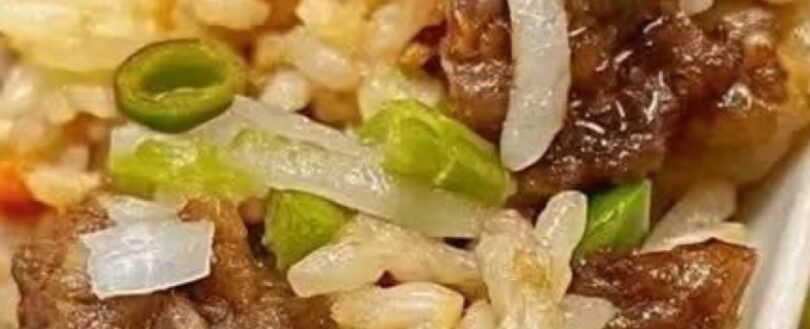 Return the cooked ground beef to the skillet and mix it with the rice and vegetables.