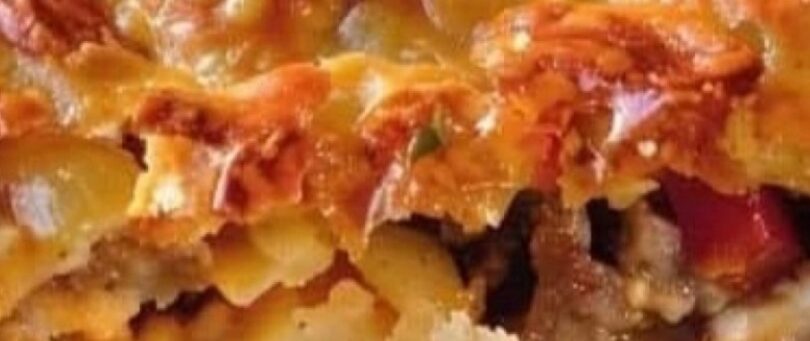 Assemble the Pie: Spread the cooked sausage in a greased pie dish. Top with the sautéed vegetables and shredded cheeses.