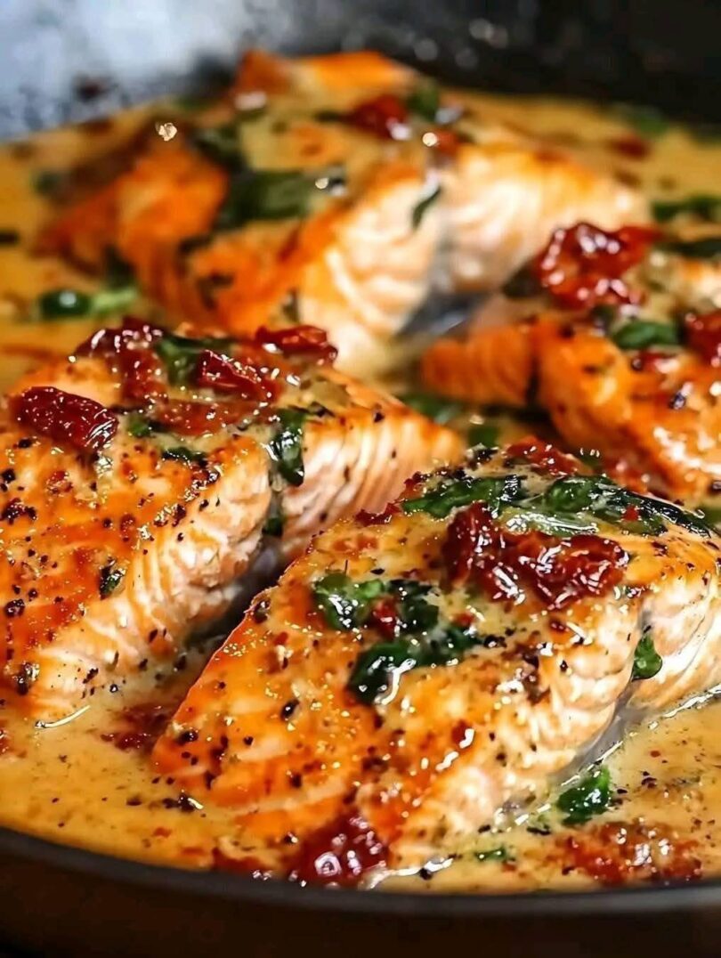 Return the salmon fillets to the pan, spoon the creamy sauce over them, and let everything simmer for another 2 minutes so the flavors can meld.