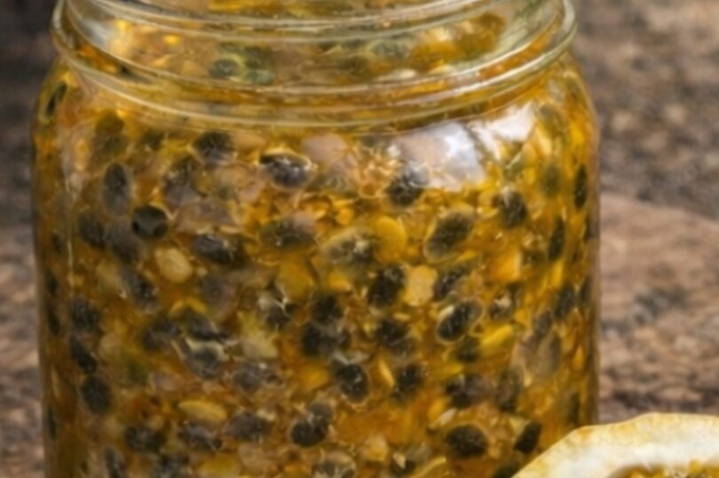 - Cut the passion fruits in half and scoop the pulp with seeds into a bowl or jar.