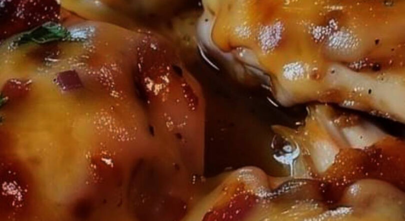 After completing the dish, decorate it with finely chopped parsley and serve immediately with extra honey mustard sauce served separately.