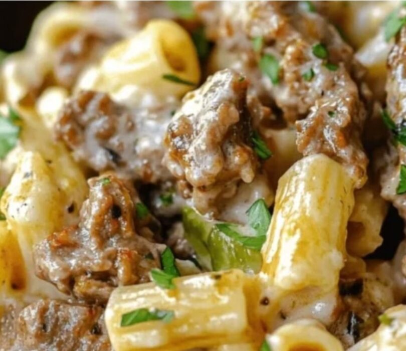 Indulge in the rich flavors of Philly Cheesesteak Pasta, a creamy and cheesy twist on the classic sandwich! Tender beef, sautéed peppers, onions, and garlic are combined with al dente pasta in a luscious cream cheese sauce, topped with melty provolone. This hearty dish is perfect for weeknight dinners or cozy family gatherings. Customize it with your favorite cheese or add a spicy kick for extra flair. It’s the ultimate comfort food that’s easy, delicious, and guaranteed to satisfy!Ingredients:1 lb ground beef or thinly sliced steak strips1 green bell pepper, diced1 onion, diced2 cloves garlic, minced8 oz cream cheese, softened1 cup shredded provolone cheese12 oz pasta (penne or rigatoni recommended)1 cup beef brothSalt and pepper to taste1 tbsp olive oilInstructions:1. Cook the Pasta:Bring a pot of salted water to a boil. Add pasta and cook until al dente. Drain and set aside.2. Sauté the Vegetables:Heat olive oil in a large skillet over medium heat. Add diced bell pepper, onion, and garlic. Sauté until soft and fragrant.3. Cook the Meat:Add ground beef or steak strips to the skillet. Season with salt and pepper. Cook until fully browned and cooked through.4. Create the Creamy Sauce:Reduce heat to low and stir in cream cheese and beef broth. Mix until a smooth, creamy sauce forms.5. Combine Everything:Toss the cooked pasta into the skillet, ensuring it’s evenly coated with the sauce.6. Top with Cheese:Sprinkle shredded provolone cheese over the pasta. Place under the broiler for 2-3 minutes until the cheese is melted and bubbly.7. Serve Hot:Dish up your Philly Cheesesteak Pasta and enjoy!Helpful Tips:Choosing the Beef: For authentic Philly cheesesteak flavor, go for thinly sliced ribeye steak. Ground beef is a quicker alternative.Pasta Perfection: Penne and rigatoni work best, but you can also use ziti or fusilli for similar results.Cheese Options: Provolone gives this dish its signature taste, but mozzarella or Monterey Jack are great substitutes.Make Ahead: Save time by prepping your veggies and softening cream cheese in advance.Spice it Up: For a spicy twist, toss in red pepper flakes or diced jalapeños.Reheating Leftovers: Warm up with a splash of beef broth or reserved pasta water to keep it creamy.PhillyCheesesteakPasta, ComfortFood, EasyDinner, CheesyPasta, GroundBeefRecipe, CreamyPasta, WeeknightDinner, FamilyFavorite, PastaRecipe, BeefRecipesThis creamy and cheesy Philly Cheesesteak Pasta is perfect for satisfying cravings and impressing the family. Make it tonight for a hearty meal packed with flavor!